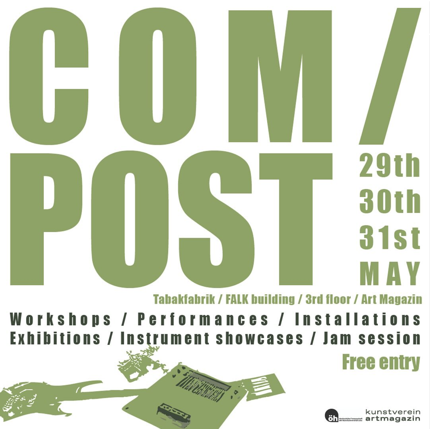 The Postdigital Lutherie students warmly invite you to COM/POST – a self-organised festival of Sonic Technobiodiversity, happening May 29–31 at the FALK building, Tabakfabrik Linz. COM/POST is a space to explore obscure sounds, the interconnections between new and obsolete technologies, and sustainable musical practices. https://www.instagram.com/compostfestival